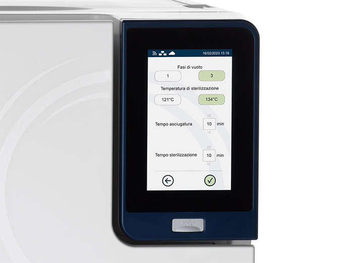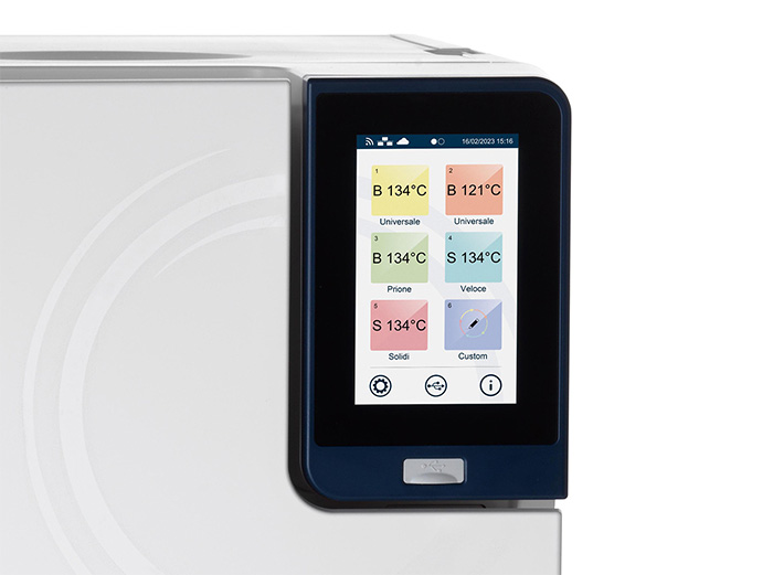 Ograniczona liczba łączeń i punktów styku ułatwia utrzymanie higieny. Szklany panel dotykowy łączy wygodę obsługi z możliwością dokładnej dezynfekcji. Charakterystyczny wskaźnik świetlny umieszczony na froncie urządzenia jasno informuje o statusie pracy autoklawu. Po otwarciu drzwi włącza się oświetlenie LED, które doświetla przestrzeń roboczą.